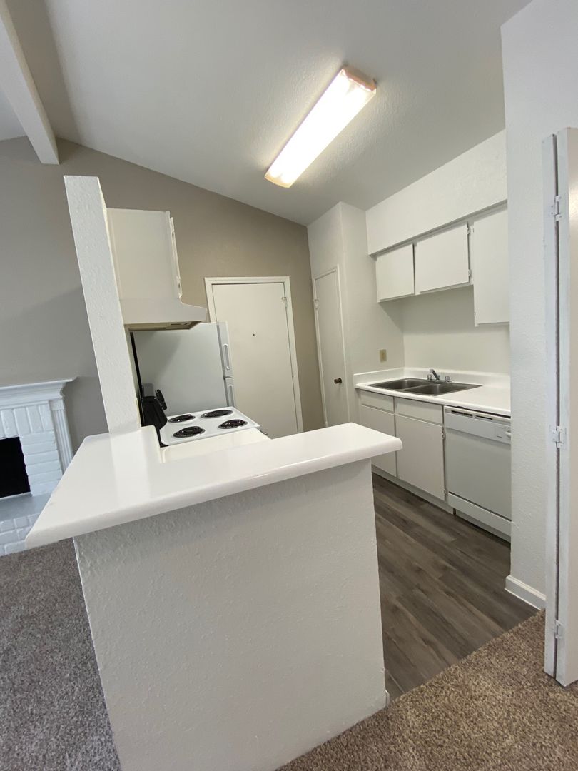 Two bedroom, two full baths, loft-style upstairs bedroom, full size washer and dryer connections and a fireplace.